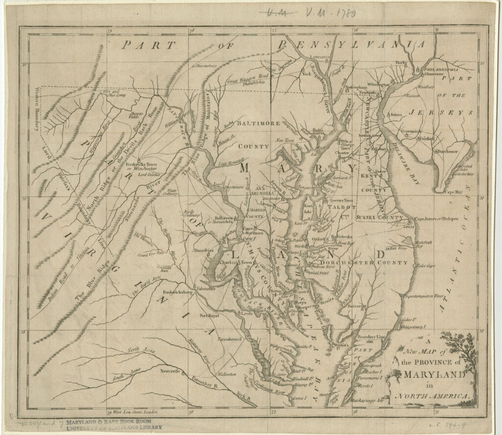 - John Hinton, “A New map of the province of Maryland in North America,” Penn State University Libraries Digital Collections, 1781, https://digital.libraries.psu.edu/digital/collection/maps1/id/30078/. ↩︎
