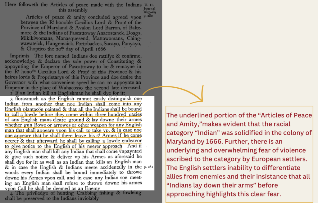 Moving into the mid to late seventeenth century and eighteenth century, it is evident that racemaking on the part of English colonists and Native Americans was taking shape. An analysis of legal documents referring to Anacostan, Nanticoke, Pamunkey, and Piscataway tribes from the Maryland State Archives reveals that the words “Indian” and “Indians” are most frequently used in the body of text. What can be interpreted from this is that “Indian” as both a racial category and widely used descriptor of people is occurring.