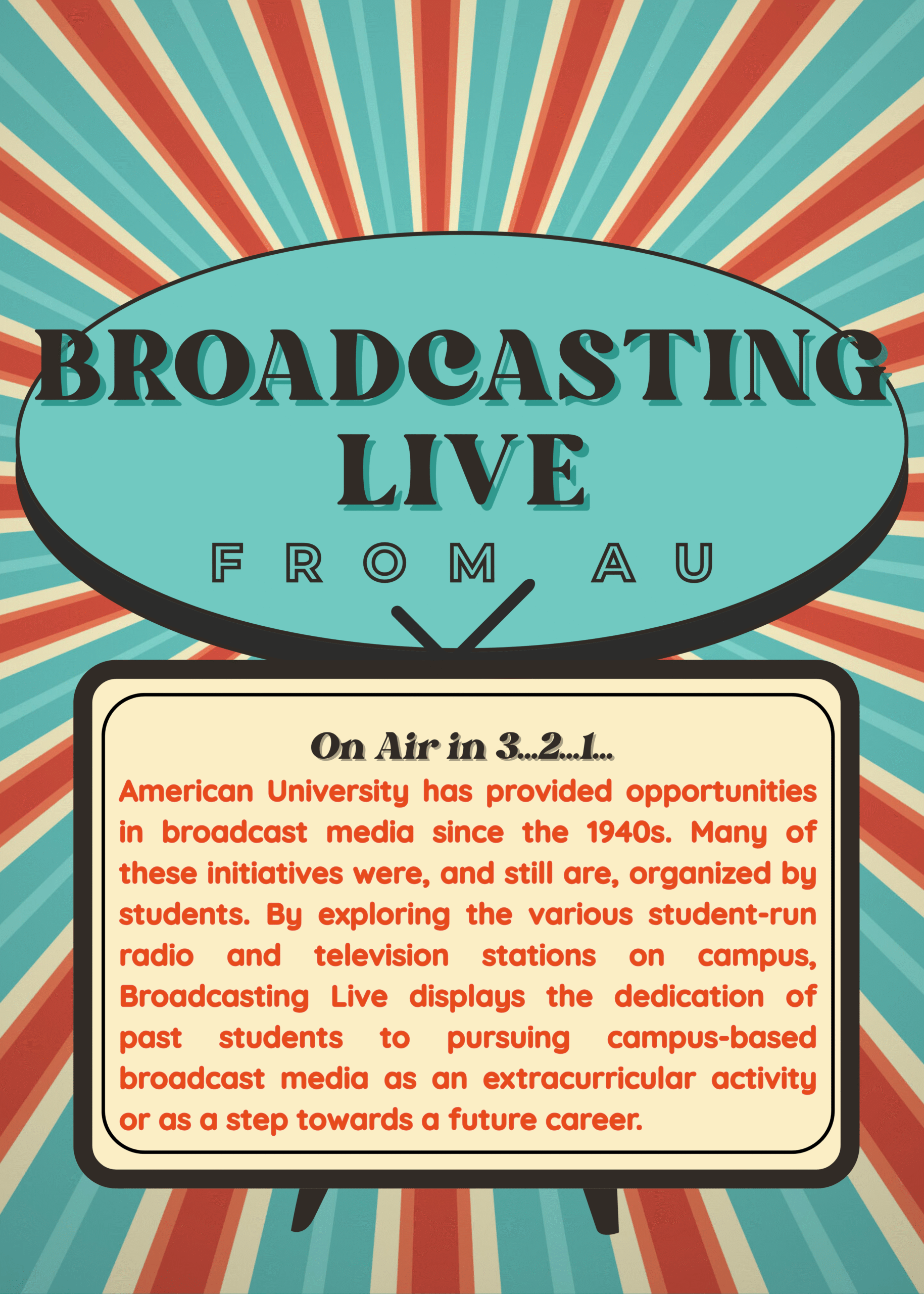 Most recently, Moody has also curated a digitally forward exhibit, Broadcasting Live, which details the long history of student-run radio and television at AU. By exploring the various student-run radio and television stations on campus, Moody’s third exhibit will soon be displayed in Bender Library to highlight the dedication of past students to pursuing campus-based broadcasting media as an extracurricular activity or as a step towards a future career. The exhibit was built around audio-visual material. Therefore, Moody was “challenged to present the materials in yet another format and ultimately decided to display clips from the students’ original television shows in the 1980s.” She is now beginning research for a new exhibit on AU’s archives in conjunction with the university’s events for the nation’s 250th anniversary.