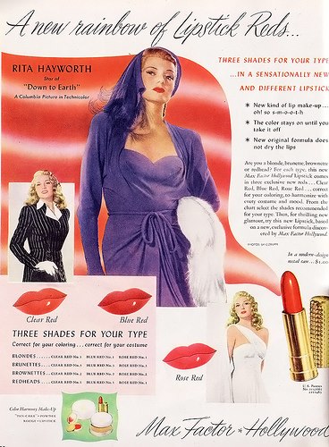 Figure 42. “A New Rainbow of Lipsticks Reds…” 1940s Max Factor advertisement. Accessed from http://4.bp.blogspot.com/-wJ1uftrbofM/ULemej1rdbI/AAAAAAAABH4/X4L1QeAirq8/s1600/314990_459185830782659_1555191842_n.jpg