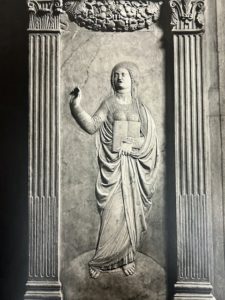 Pollaiuolo’s Rhetorica also lacks the attributes that Alain de Lille gives the figure in his writing: a trumpet and horn as she builds the chariot platform in his scene.[68] However, Pollaiuolo utilized the details of her hair in the latter text, as there is an appearance of gold and “the coil of [her hair] clothes her neck.”[69] Apart from this small detail, Pollaiuolo’s figure of Rhetorica inventively appropriated the visual source of the Tellus coin to create his entirely unique figure of Rhetoric. The only textual sources and descriptions that can be identified within the image are through the inscription on the book. As such, Rhetoric, and her reverse mirror figure of Grammar, showcase Pollaiuolo’s inventiveness and unique depictions of the disciplines. This mirroring of poses and reflection across the tomb will be further discussed once all the disciplines have been examined.